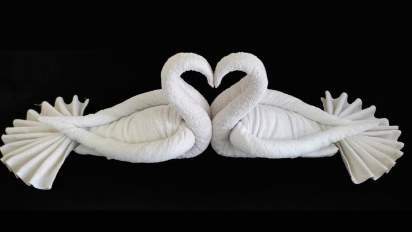 “ரொம்பச் சிம்பிள் சார்“ என அவள் அந்த அன்னங்களைக் கலைத்து டவலாக்கினாள். மீண்டும் அவர் முன்பாகவே மடித்து அன்னங்களாக உருமாற்றினாள்.
