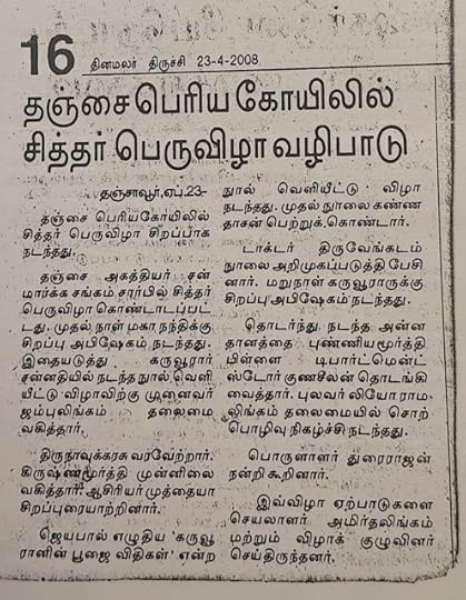 இந்த நூல் வெளியீட்டு விழாவில் தலைமை வகிக்கும் பேற்றினைப் பெற்றேன். தலைமையாற்றியதும், விழா தொடர்பான செய்தி நாளிதழில் வெளியானதும் நெஞ்சில் நிற்கும் அனுபவம்.