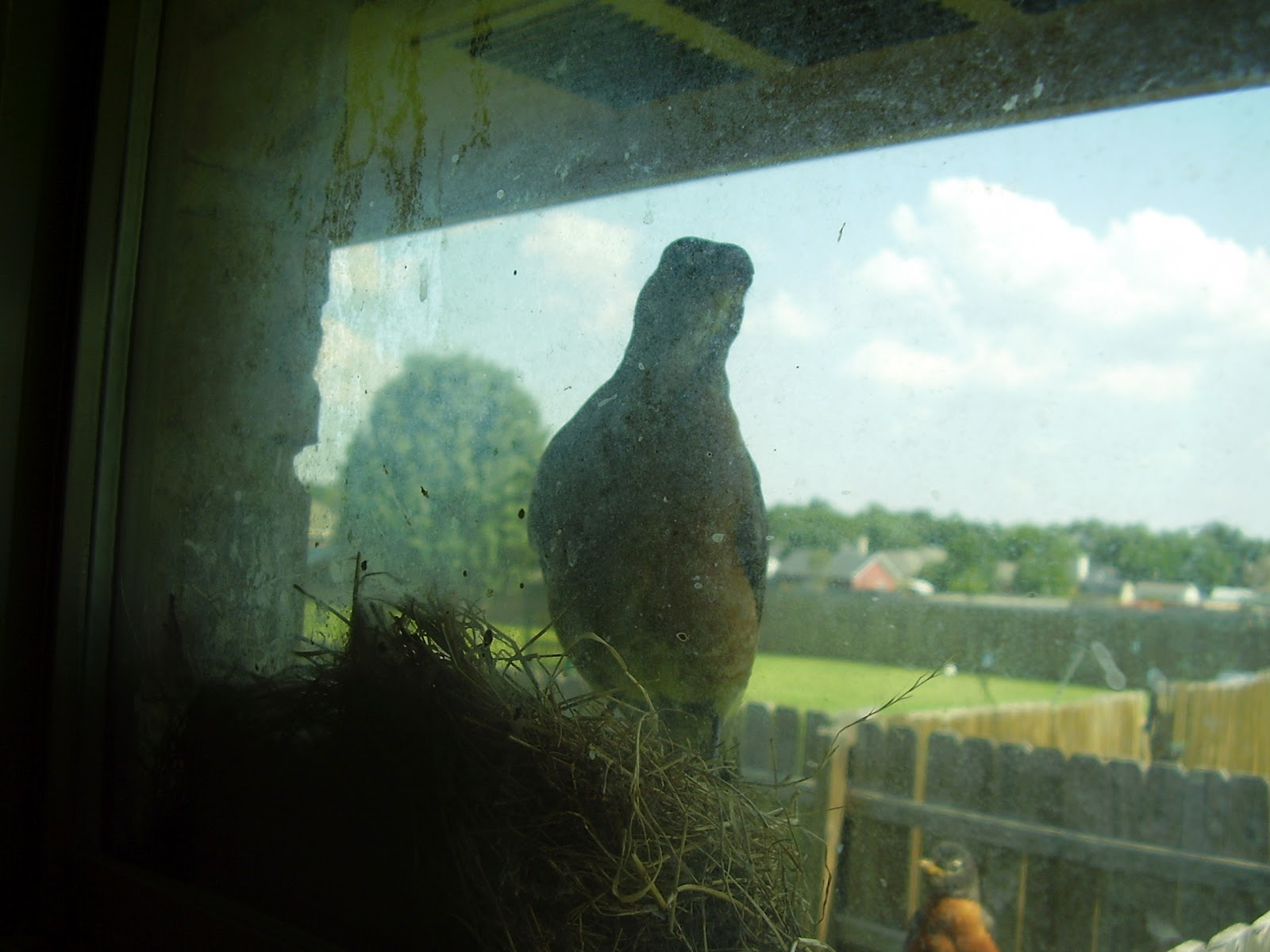 (2) I also have a resident Robin. A few weeks ago, when I turned the shower on in my bathroom, I noticed a bird pop up on the high windowsill outside the long, narrow window above my tub. It had some grass in its beak. It soon built a nest in the corner under the eaves of the house, complete with a mud base to hold it safely in place, and I assumed it had laid some eggs. I only saw one bird, and it was always sitting on the nest whenever I took a shower. When I reached for the shampoo bottle that sits on that ledge, the mama bird would stand up and look through the glass at me. She was always alone until today. This time there was a second bird up there too. They both chirped at me when I tried to climb up on the side of the tub and peer into their nest. I did see two baby birds, and both parents were making this little barking sound which I assume was a warning of sorts for the babies to stay hidden. Since Robins can lay 3-5 eggs, I think there may be more babies. I've actually heard the birds singing in the mornings. These babies should fly away within a week or so given how big they looked.Perhaps you can now see why I now call this "the bird house". Wish all of you could see these little chirping critters!