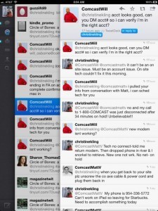 On Wednesday, Day 7, they told me that the other gentleman was adamant that they should not disconnect his Internet and his correct address was still not showing up in the system because no one had ever ordered Internet from there before, so they could not activate me. At this point I said, “Wait, I’ve done nothing wrong, but this other guy who gave the wrong address is not going to suffer at all, while I’ve been struggling with you guys for a week to correct his mistake?” Finally, after nearly 45 minutes on hold, the fellow came back and said my account was activated and he would connect me. Whether that meant he cut off the catamaran or whether they were finally able to change the other guy’s address in the computer, I don’t know. But then, he couldn’t get connected to my modem, so he put in an order for a service technician to come out the next morning. Frustrated and fuming, I grabbed my iPad and opened Twitter. I began to tweet about my woes with Comcast. I found a twitter handle @ComcastCares and I let fly.