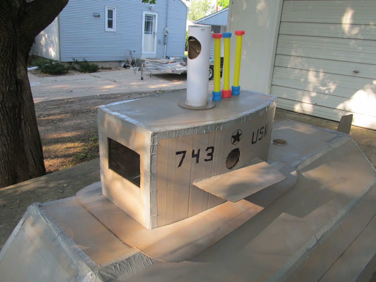 This summer, after a few weeks of work, I built my submarine. It was fun and at least I amused my neighbors. It really is over 7 ft long and can comfortably seat two children (or one adult). It fires torpedoes and nuclear missiles (with rubber bands just like the original). It has a working periscope, portholes, and light up control panels."