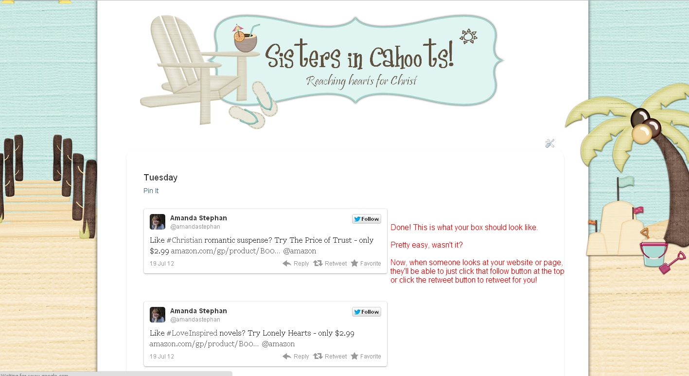 Did you know you can now embed a tweet on your website? I didn't have any idea what that entailed, so I tried it to see what would happen. I came up with a tweet I thought might speak to a certain group of readers and tweeted it. Then I embedded it onto my page on our blog. (Check it out HERE and tell me what you think!) It's now located up at the tippity-top of the page and visitors can retweet exactly what I said at the push of a button.