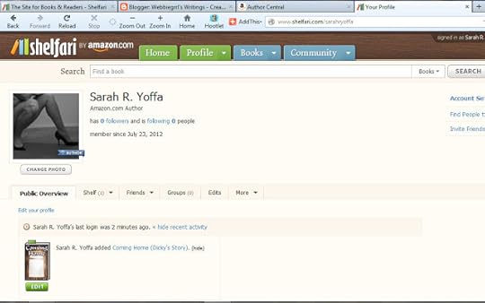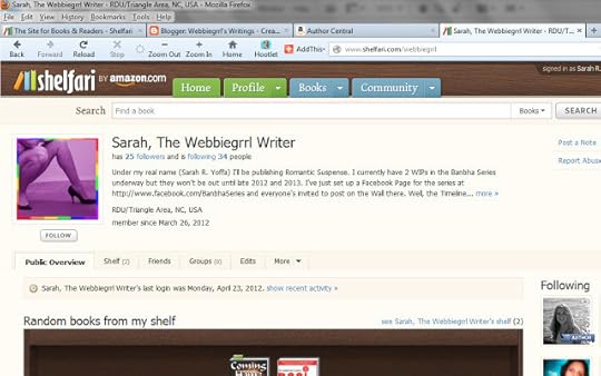 Yes, again, I just created this account yesterday. Why hadn't I done any of this before? Because I had created everything for "Sarah, The Webbiegrrl Writer" and apparently, Shelfari will not let me use that to be "Sarah R. Yoffa" as well. This is a great example "in action" of what I warned of in this week's Monday Marketing blog: be very careful what name you choose and how you use it. One little change can make you a whole new Author to the publishing world!