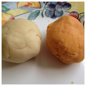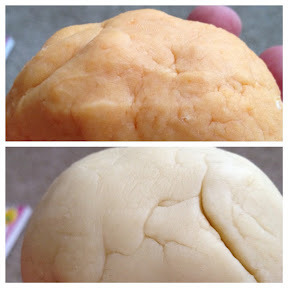 So I made two batches - the orange (top photo) is the original recipe, while the pale yellow (bottom photo) was made with Cream of Tarter.