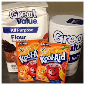Since I couldn't remember the recipe - and I was standing in a store when I thought of this idea - I googled the words "Kool-Aid playdough."
