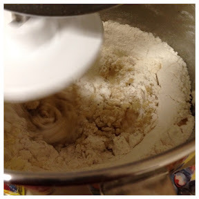 When the water has boiled, mix in the ingredients together, until well blended. (If you don't have a mixer with dough hook attachment, you'll want to use your hands to kneed it until smooth.)