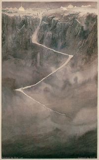 Sam finds Frodo’s body in the tower of Cirith Ungol. After fighting off his captors, Frodo awakens and takes the Ring from Sam. They descend the stairs into the land of Mordor and steal some Orcish armor and vestments so they can blend in with the host. However, they find the land largely empty as the armies are being called away to deal with a threat at the Black Gate.
