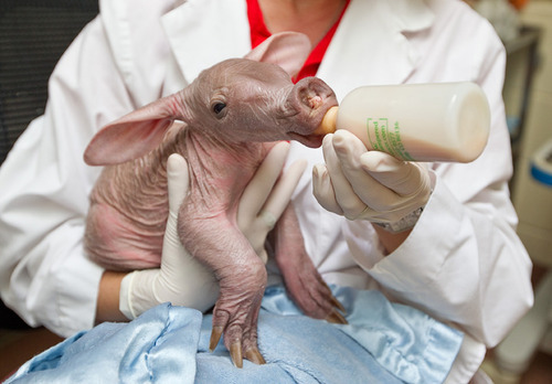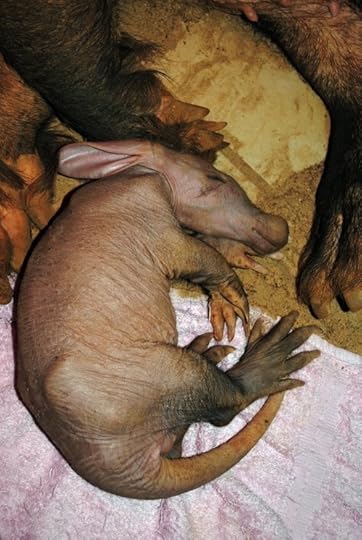 Everything about the baby aardvark is a little odd–the floppy ears, the elongated piggish snout, the lumbering feet, the wrinkled skin, the sausage tail–and the whole effect strikes me as what Dr. Seuss would come up with if you had asked him to design an alien mammal.