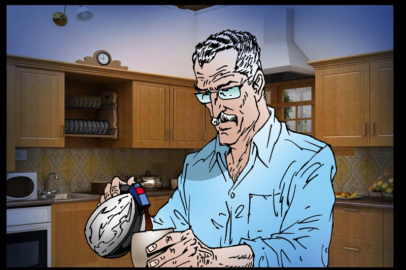 يهرع إلى المطبخ ويعدّ لنفسه كوبًا سريعًا من الشاي ـ (رسوم: فواز) ـ