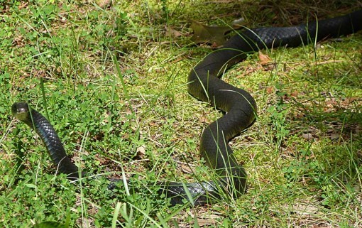 In our back yard just now, a large Black Racer, probably four feet long. Heading toward the pond, probably looking for a frog for lunch. I headed him off, but he might well be back later when I’m not around. The cats spotted him first, of course!