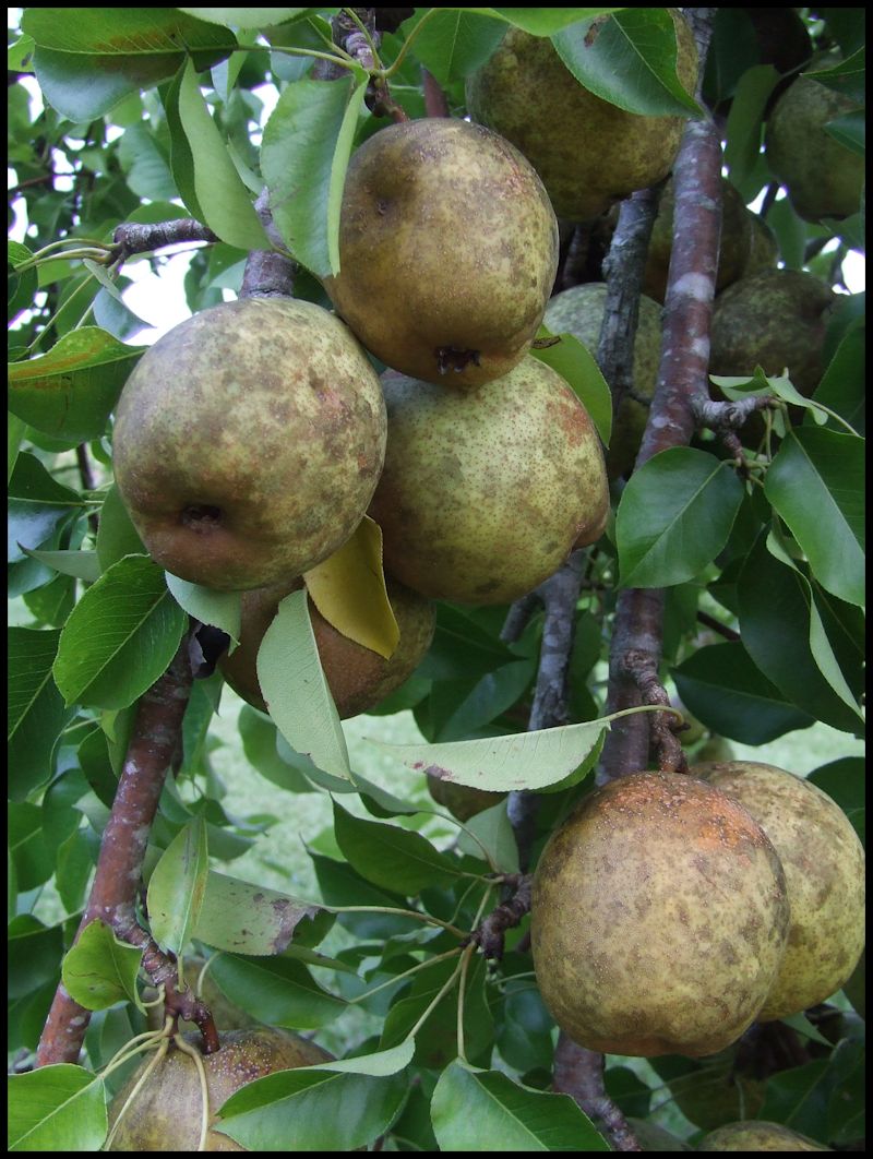 Next up in the non-sequitur parade are pears. Specifically, the pears produced by a scraggly five-dollar pear tree I bought on a whim at a big-box store years ago. It was a little more than chest high, hardly more than a weed, really. But now it is a pear-producing machine, people. Seriously. There are hundreds of not particularly beautiful but certainly very tasty pears hanging from this determined little tree right now. Here's a shot of just one branch: