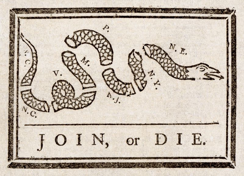 Their frustration with finding themselves in a country of diversity is to cut off that part of the country they don’t like…and to try and find some kind of validation for this behavior in the founding and history of the country. But it’s not there. Contrary to the neo-secessionists now overrunning the red states, Franklin did not see “Don’t tread on me” as a motto of State’s Rights. He saw it as a motto of union, as illustrated in his famous woodcut.