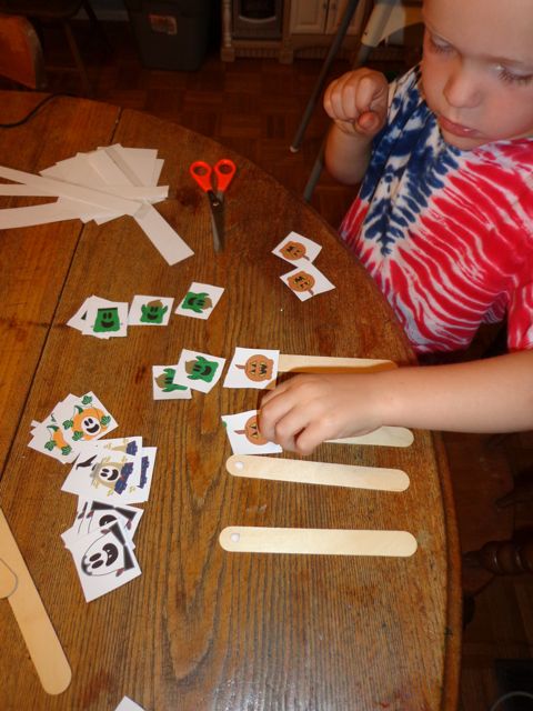 I dabbed glue on the end of each tongue depressor and my son placed on the characters.