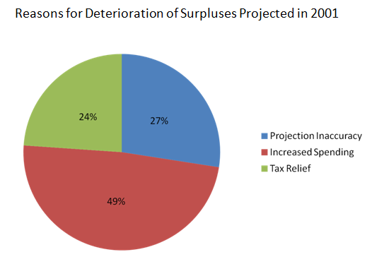E21: “Roughly half of the reason the surpluses never materialized is that federal spending was subsequently increased (over half of this total increase was concentrated in the three years of 2009-11). A little over one-quarter disappeared because of subsequent corrections to the 2001 projections. Less than one-quarter was due to tax relief of any kind and only a little more than half of that small fraction is directly attributable to the 2001 and 2003 tax relief packages.”