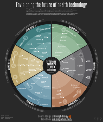 In any case, here we have a table representing the future of health technology, as predicted by ET. Diving their findings into the fields of Augmentation, Biogerontology, Diagnostics, Telemedicine, Treatments, and Regeneration respectively, they attempt to show how small advancement in the near future will branch outwards to more radical ones in the not-too-distant future. The rough dates correspond to their previous graphic, starting with modern day research and culminating in 2040.