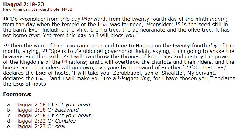 http://www.biblegateway.com/passage/?search=Haggai%202:18-23&version=NASBI first read this passage a long, long time ago, and reading it, immediately thought 'hey, twenty-fourth day of the ninth month - that's my birthday!' I've learnt since then that the Jewish calendar isn't the same as our current Gregorian calendar, so doesn't