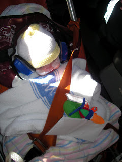 Cailyn wears her ear muffs! She carries a Child Flight Pelican, given to each child who travels with the Child Flight team.