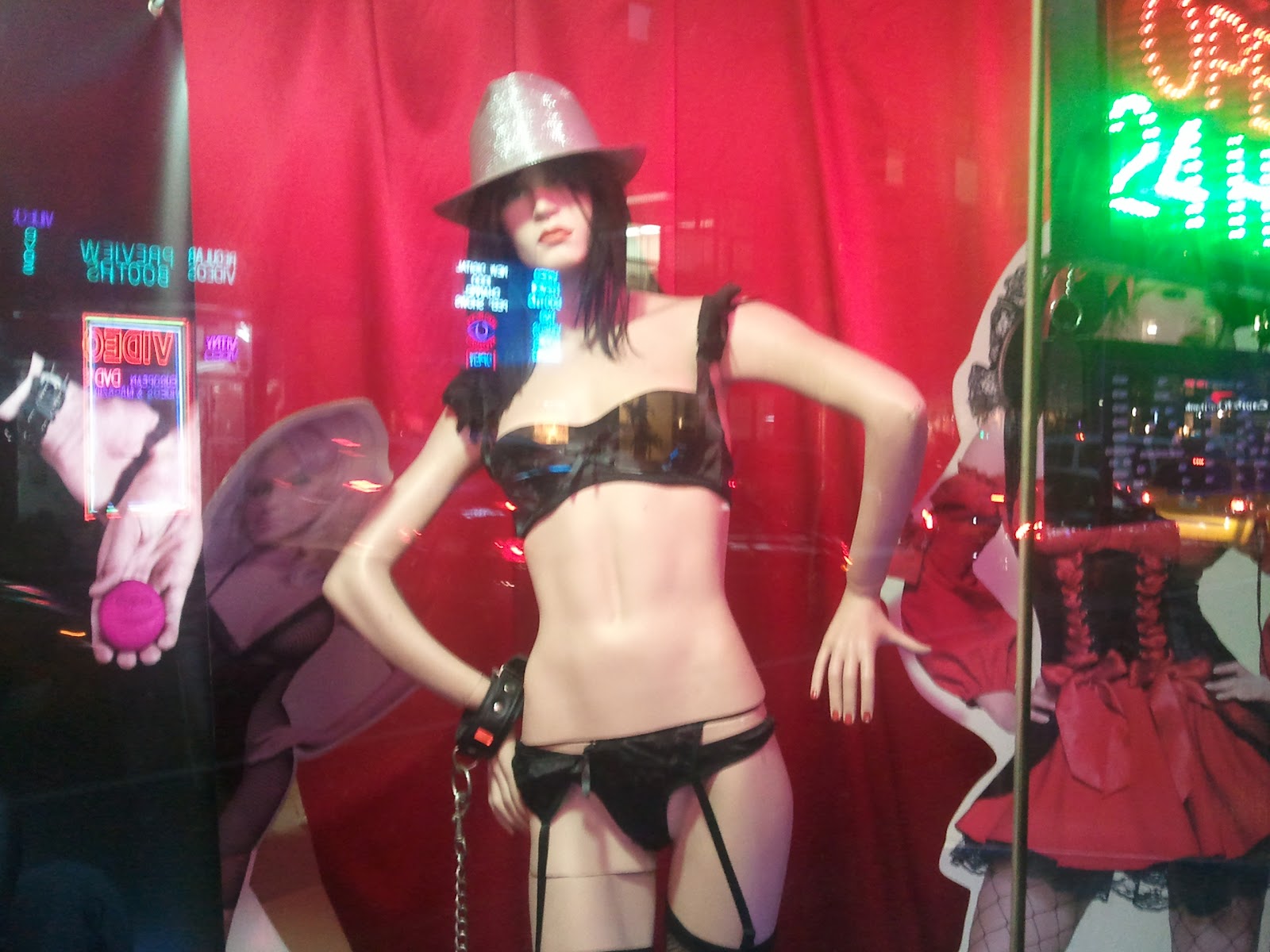 This mannequin won't leave me alone, I swear to God. Every day I walk past her on my way to Sixth Avenue to get a coffee or an Atkins bar or an apple or a hit of acid, and there she is, dressed in her sexy skivvies 'n chains 'n leather wristband thingies, giving me that come hither look. As if. Come on, mannequin, you've been around the block. Surely you know you are barking up the wrong tree. I don't even like wristbands! And how do you stand like that in that position day after day after day? It's not natural, mannequin, to put your arms and hands in that position for long stretches of time. Who taught you to do that, Anna Wintour? Give yourself a break and sit down for a while or something.