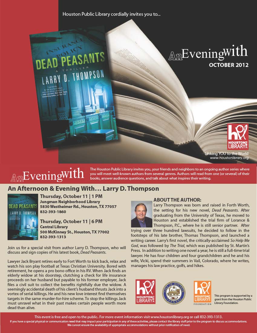An Afternoon and Evening With Author Larry D. Thompson - October 11th 1 and 6 pm - Houston Public Library