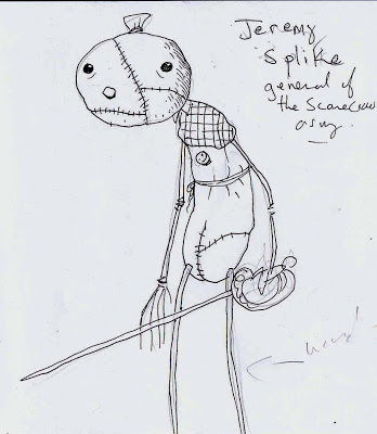 Just back from a wonderful Fall bike ride. It's gorgeous out there today. Here's a sketch of Splike a character in the first Maddy Kettle book, part of an army of scarecrow guards. This guy seems appropriate for the weather today. This weekend I'm off to cottage country in the north, Muskoka, and it's the first time I've visited there. Really looking forward to this.