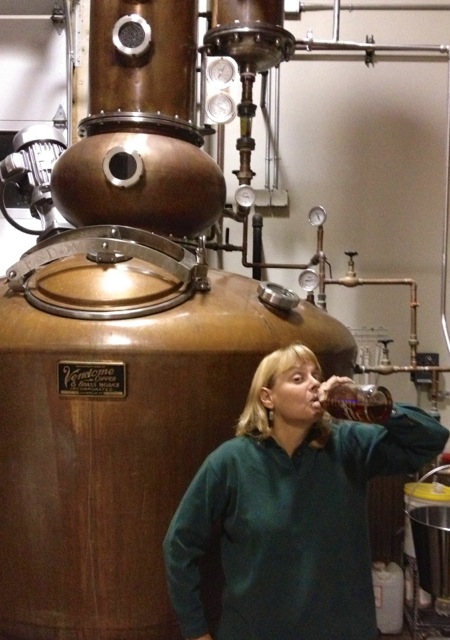 Breckenridge Distillery. The tank ran out in the midst of filling bottles, so two bottles were left partially full. The volunteers volunteered to dispose of that extra product after our work was done, and the bottles were passed around. Here I am in front of the still doing my bit to help clean up: