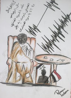 أعلن ساعة الوفاة اليوم الموافق .....وبينما كنا في محاولة لتحديد معالم الجريمة ، إذا به ينهض ... نفض القليل من الغبار الذي يغطيه.. وحمل قطعة قماش علي ما يبدو أنها "علم" لدولة ما .. حمل معه أيضا صورة لشاب في العشرينيات من عمره .. وقد كتب عليه صديقي (أحمد) ... ووضعت علي الصورة شارة الوفاة ...ترك باب شقته مفتوحا .. وتركنا في فوضي ومحاولة لاستيعاب الموقف .. جريت خلفه ورأيته يقف في الميدان المقابل لشقته والذي كان اسمه يوماً (ميدان التحرير) ...وما هي الا دقائق قليلة ووجدت بجانبه آخــرون ...وجميعهم يحملون شعاراً واحـــداً (الثورة مستمرة) ..لكن المفاجأة أن هناك طلقة استقرت بين عينيه أظنها قادمة من أعلي العمارة التي يقطن فيها ... فسقط صريعا.وضعه زملاؤه جانباً .. والتحف أحدهم نفس العلم .. ونفس الراية ... لكن وضعت بجانب الشعارالسابق جملة أخــري :{مــش بالرصاص ..ولابالموت هنتهي .. أنا الي فيها هعيش .. ولو مت إيه يعني .. دانا يادوب هبتدي} .ســارهـْ عليالرسمة للرائعة / رنيم هشام
