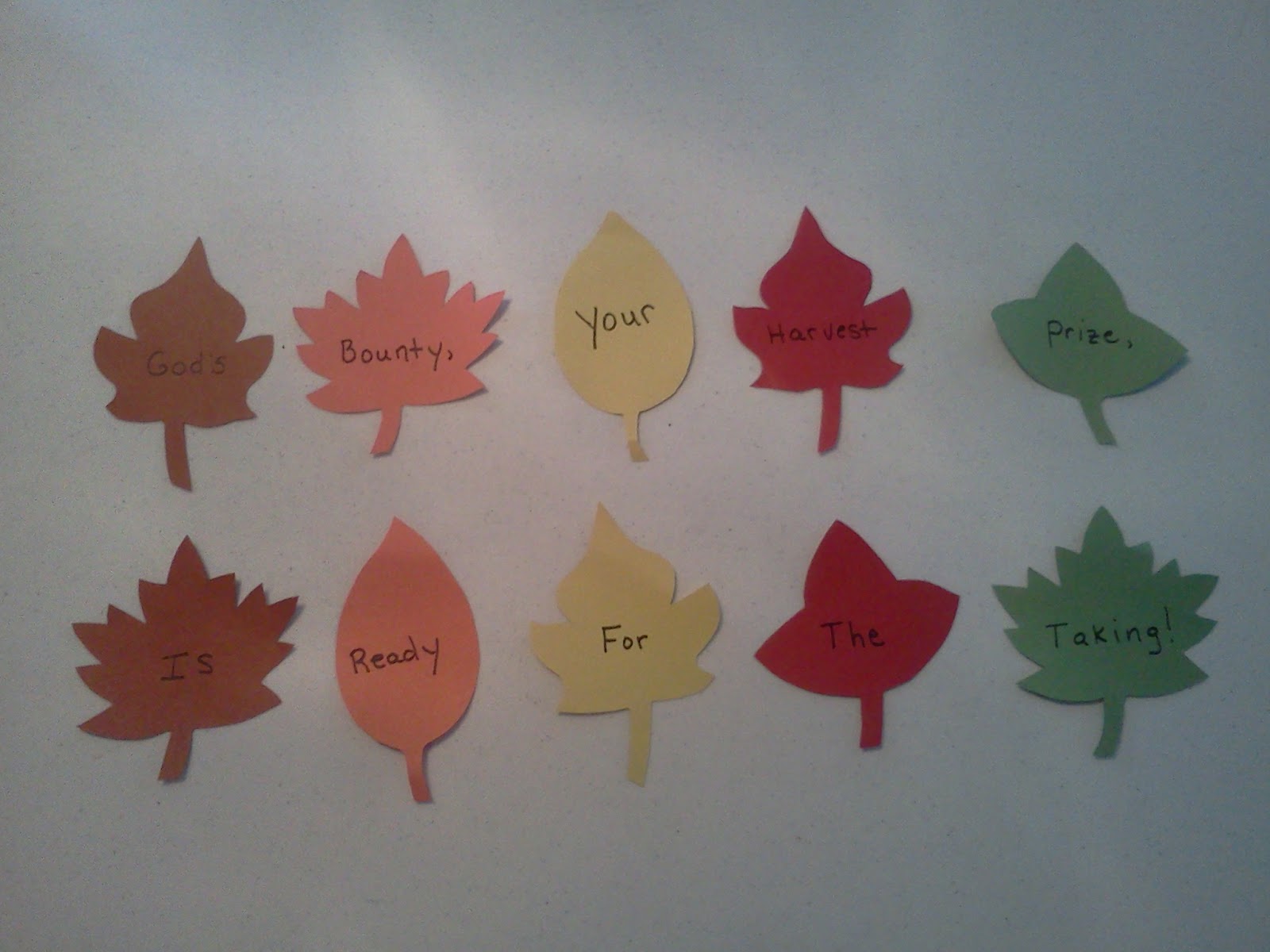 It occurs to me as I type this post, that this idea would even be great for birthday parties or other celebrations. All one would have to do is change the words to match the occasion and change the leaves to anything from balloons to crosses. Anyways, Happy Harvest everyone!