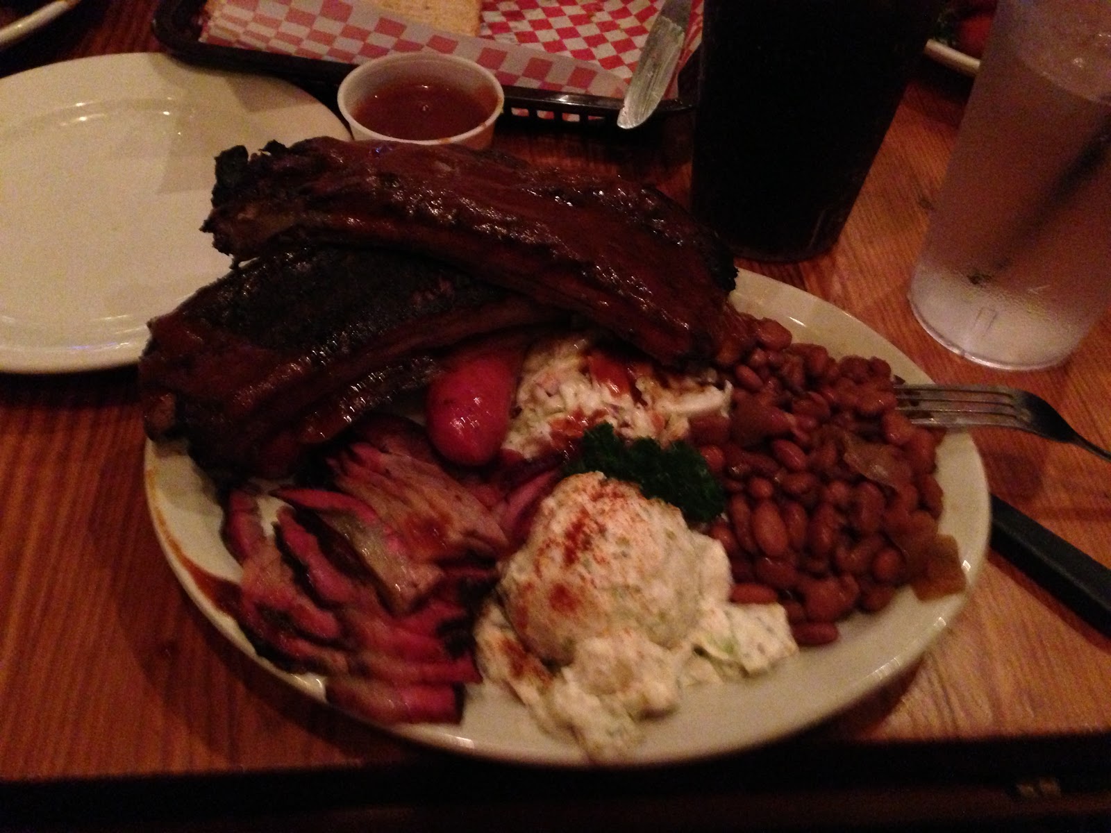 Thought most of the day went to work, the highlight of this first Austin night was, as per my tradition, dinner at the County Line by the Lake and dessert at the nearby Amy's at the Arboretum.  As you can see, the barbecue plate--beef ribs, sausage, and brisket--was huge and delicious.