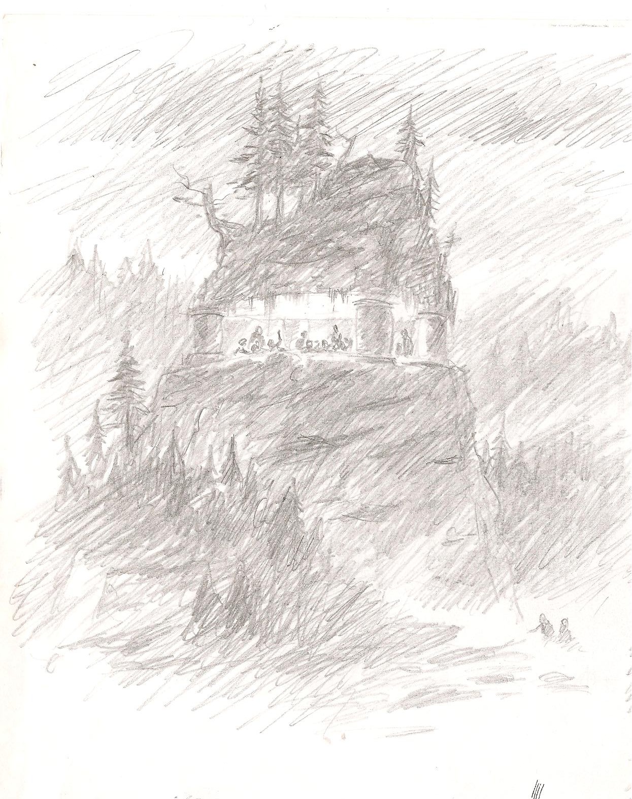 I was halfway over Troll Fell, tied and wet and weary, when I saw a bright light glowing from the top of the crag, and heard snatches of music gusting on the wind.  I turned the pony off the road and kicked him into a trop up the hillside.  I was in one of our own fields, the high one called the Stonemeadow.  At the top of the slope I could hardly believe my eyes.  The whole rocky summit of the hill had been lifted up, like a great stone lid!  It was resting on four stout red pillars.  The space underneath was shining with golden light and there were scores, maybe hundreds of trolls, skipping and dancing.