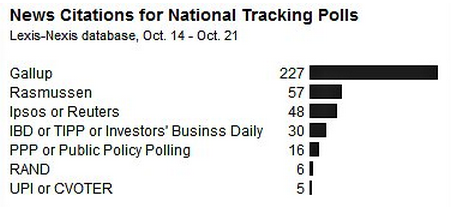 (Courtesy of Nate Silver.) Gallup is the huge outlier among the tracking polls, which shows Romney leading by 6–7 points. (On average, the national polls show an exactly tied race.)