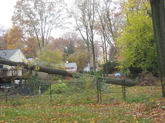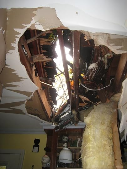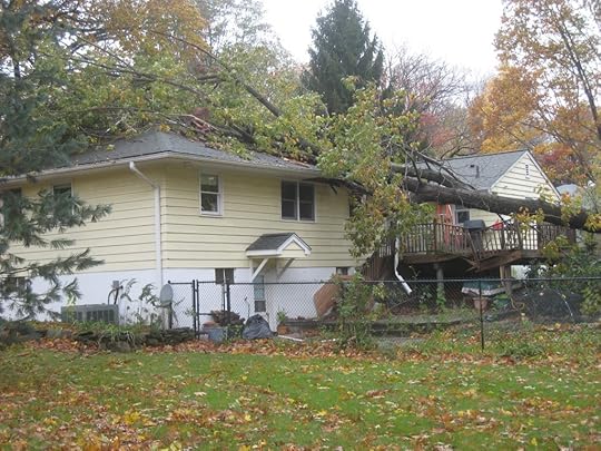 As I type this, there’s a tree in my kitchen. And my spare bedroom/office. And I don’t mean a bonsai. No, I’m talking about a 100+ foot oak, formerly tall and majestic, but now uprooted and lying diagonal, balanced precariously between my yard and rooftop. It came down just as Sandy made landfall to the south and winds shifted from merely unnerving to downright terrifying. It came down with an impact that shook the house, knocking books and cups from shelves and turning pictures on the walls sideways. Several larger limbs tore instant skylights through the ceiling, sending sheetrock and shingles, leaves and splinters flying across my kitchen floor.