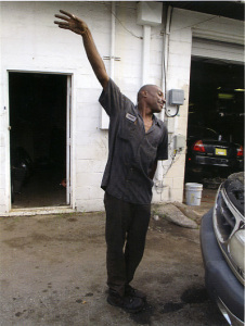 Carl told me that he takes inspiration wherever he finds it, and lately he’s been captivated by the same German choreographer I’ve been blogging about. Carl is a former architect from New York — not a dancer — and the Wim Wenders movie “Pina” was just a starting point for him. What he’s trying to capture is the intrinsic value and joy of what he calls public gesture. Pina spent years with her dancers, giving them emotional and descriptive cues and then developing the movements her words inspired. Carl doesn’t get as much time with his subjects – mostly working men from around the Athens area, where he lives now, who agree to help him. He lets his subjects come up with their own gesture, and then he stages them against an architecturally interesting background in natural light. The poetry is in the simplicity of the composition and sometimes its contrasts. Not surprisingly, Carl says he gets much bigger, more powerful “gestures” from total strangers than from the friends he’s tried to Shanghai into posing. He doesn’t explain who Pina Bausch is or why he celebrates her in the movements of mechanics, truck drivers or hospital orderlies. He figures their gestures tell the story anyway.