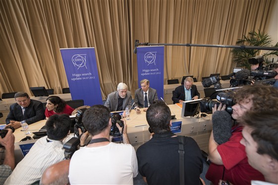 Press conference announcing the discovery of the Higgs Boson particle that gives mass to elementary particles (c) 2012 CERN