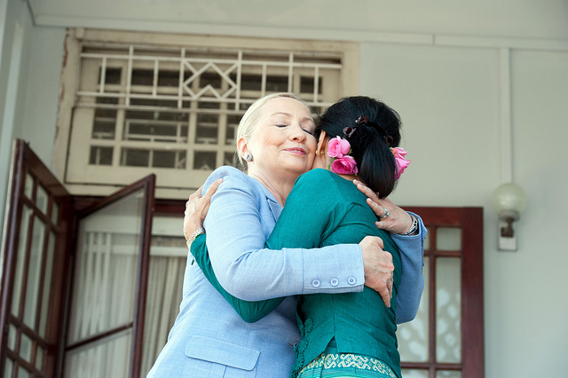 U.S. Secretary of State Hilary Clinton hugs Daw Aung San Suu Kyi at her house in Rangoon, Burma. In April 2012, the Burmese opposition leader was elected to the Burmese Parliament. State Department photo/ Public Domain