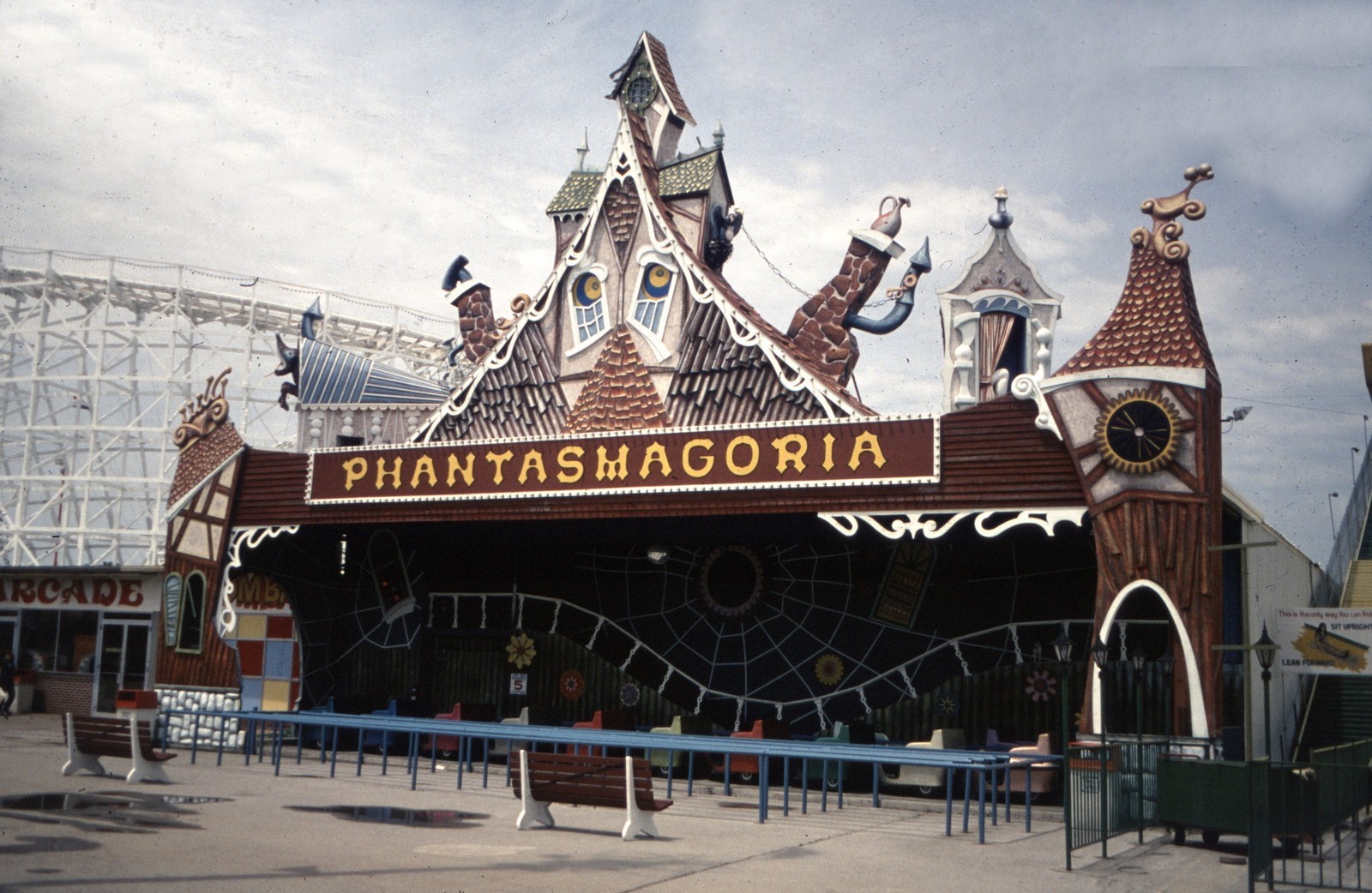 The Phantasmagoria is a defunct dark ride that spooked its way into my psyche when I was a boy, and consequently, it's been the subject of many posts on this ol' blog. My latest excuse to write about it is a beautiful image that I stumbled upon on ebay, a rare photo of the Phantaz as it appeared in its heyday. Every fixture on the facade is intact and the paint shows no signs of weathering which leads me to believe the ride was freshly constructed. It's the largest, full color picture of the attraction that I've seen online. We are also treated to a glimpse of the giant slide and the arcade that sandwiched the spook house, creating an irresistible trio of fun.The image is one of many prints that seller chutes5632 offers which are produced from vintage slides. Bidding starts at $6, and he relists his items once the auction is complete. (When the auction is active you can easily find it by searching: Phantasmagoria, Tulsa.) He is serving mankind very well.