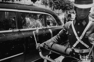 [Image Credits: Paul Schutzer snapped this image of Nixon's long-suffering car as it moved through Caracas on May 13, 1958.]