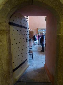 Note the plain wall sconces, a single candle with a polished metal plaque to reflect the light. One can imagine how gloomy it would be at night or on a rainy day. And then we have a glimpse at the kitchen along with a rare view of my patient party who accompany on these trips. Most of the time they avoid the camera lens but as you can see I caught them here. So next time we will take a peek around the kitchen.