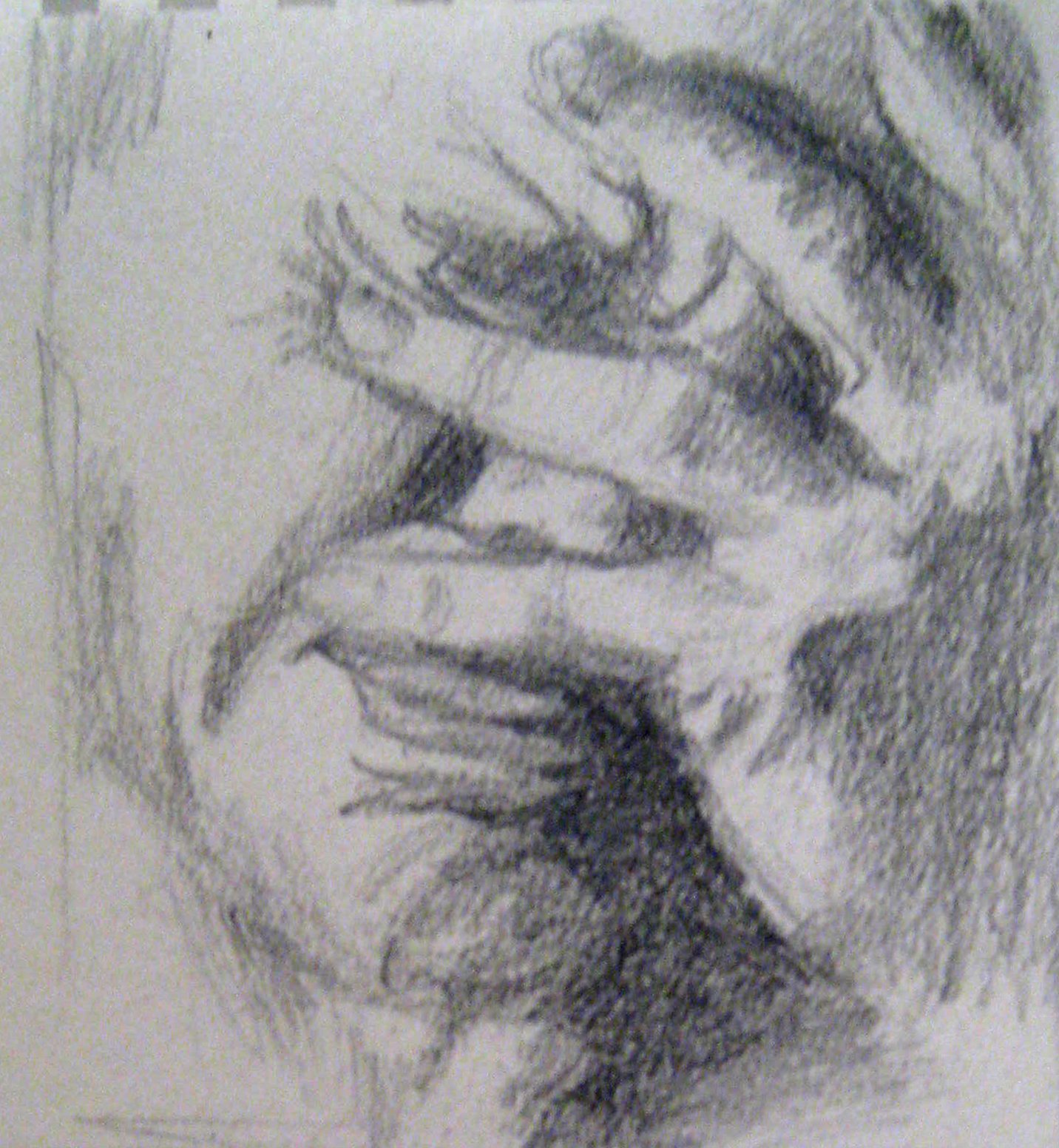 In this charcoal sketch you can see how I study the features of the face at the moment of shock, when in a flash, you are facing that which you would not face before. A moment of truth can be a personal one, which you experience in private, or a communal one. Which is why I used this sketch also in my large oil painting, Earthquake.