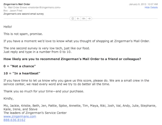 That’s a fantastic email. Short, friendly, clearly written by someone who understands tone, brand, and how to get feedback that’s useful. No tricks. Yes, it’s automated, and signed by a team, but that’s fine. It was originally written by someone who cares. It’s consistent with Zingerman’s casual catalog voice, too.