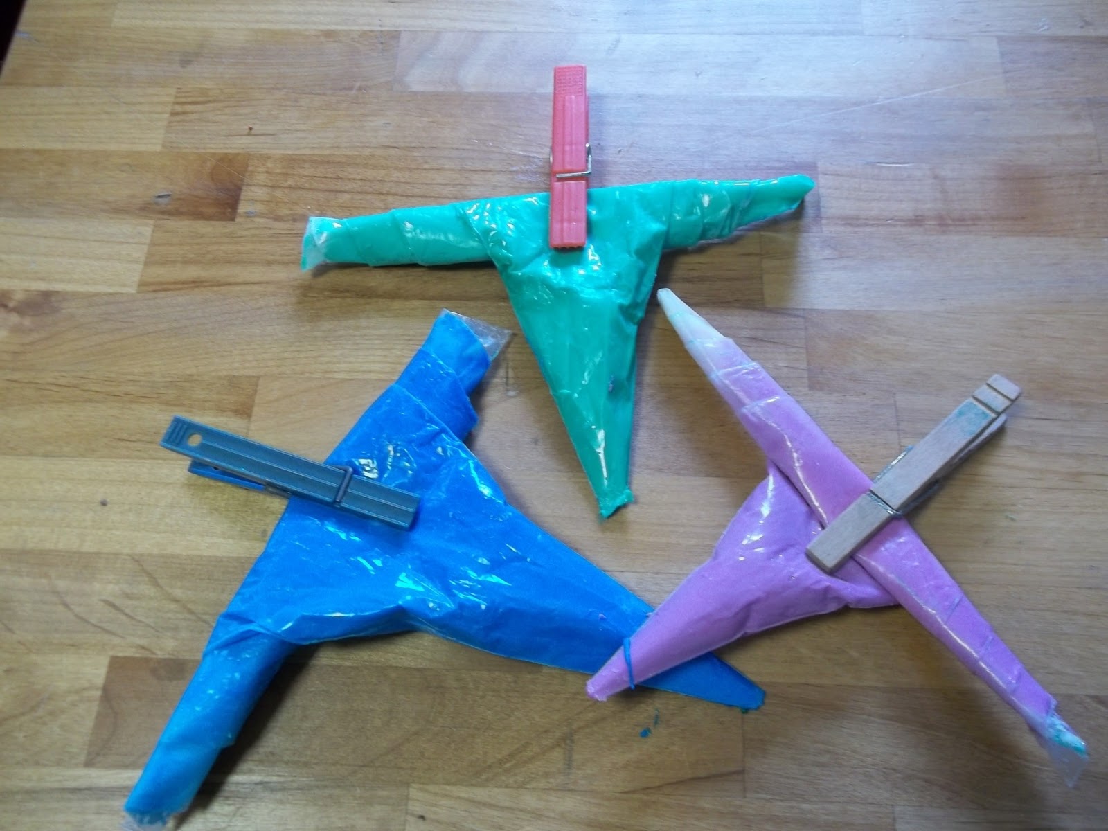 Plastic Icing Bags with clothespins to keep the icing in place (works for tooth paste too).