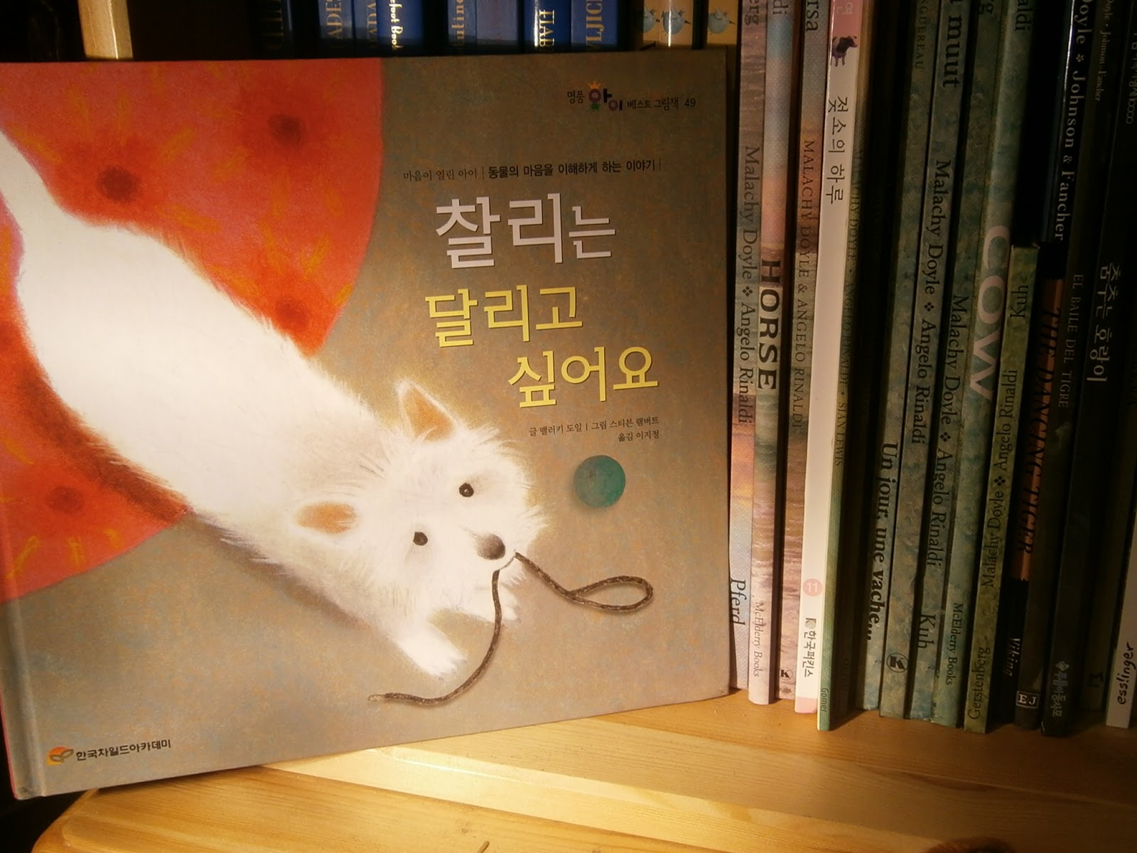 In the background some of my children’s books, including a shelf of foreign editions of ones I’ve written. I particularly like when they come through in Korean! (This is Charlie is My Darling, by the way.)