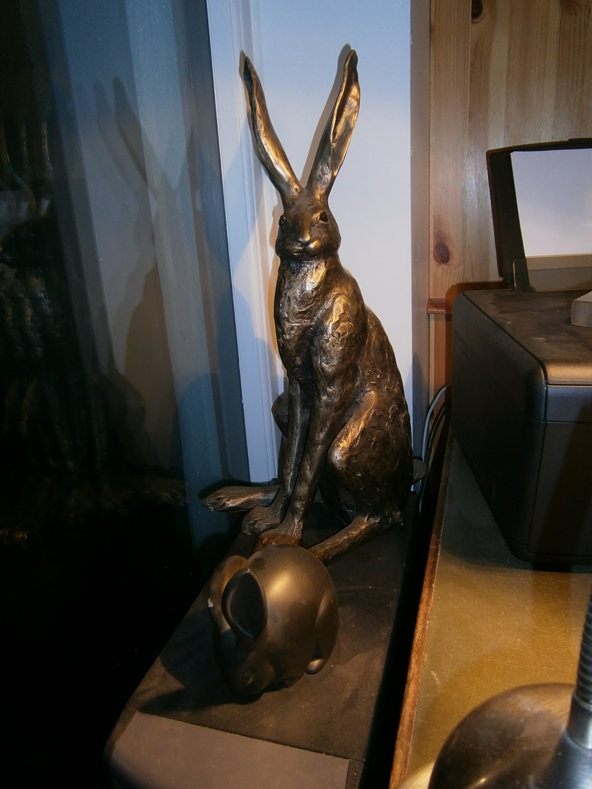 Next to the printer is a beautiful bronze hare, who’s watched over me for many moons as I write. Sitting at his feet is a little art deco rabbit.