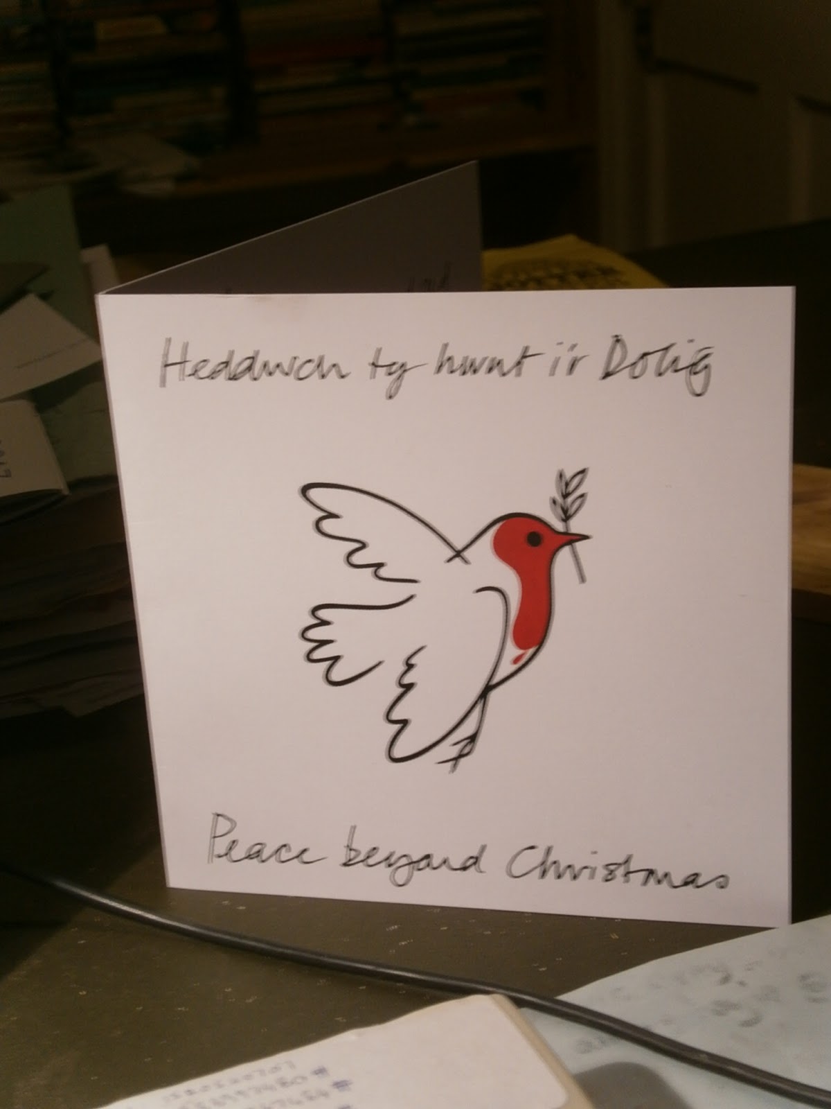 Next to the keyboard is a card drawn by my good friend (and illustrator of three of my books) Jac Jones. ‘Peace beyond Christmas’ Jac’s written, in English and Welsh, and inside he credits the image as ‘copyright Jones and Picasso.’