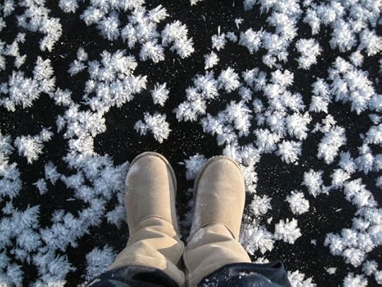 It wasn’t long this morning before cold hands and warning noises from the not-quite-thick-enough ice sent me scurrying back to the stairs. I’ll be working in my writing room overlooking the frozen lake today, warmed by hot tea and a space heater…and the memory of magical flowers that bloom on the ice.