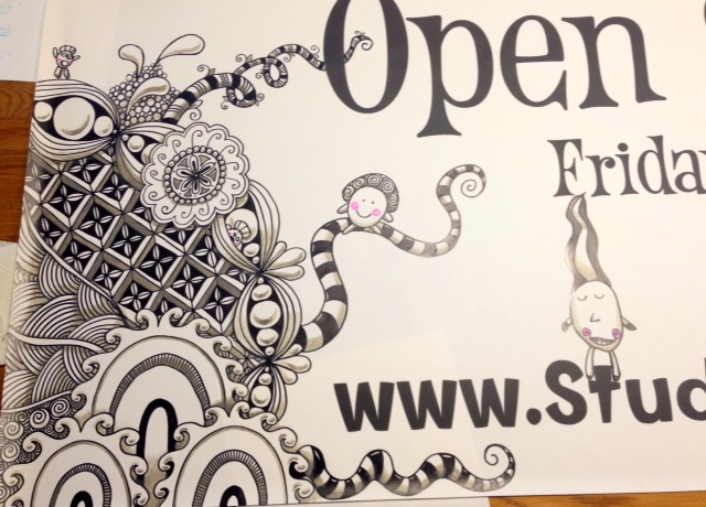 I was right to just open the studio and then figure out how it was going to work. Some changes are unpredictable, but others make complete sense. After being asked a hundred times, "When are you open?" I finally realized I needed another sign! Staples agreed with me and offered a special deal on ginormous banners. How could I resist?