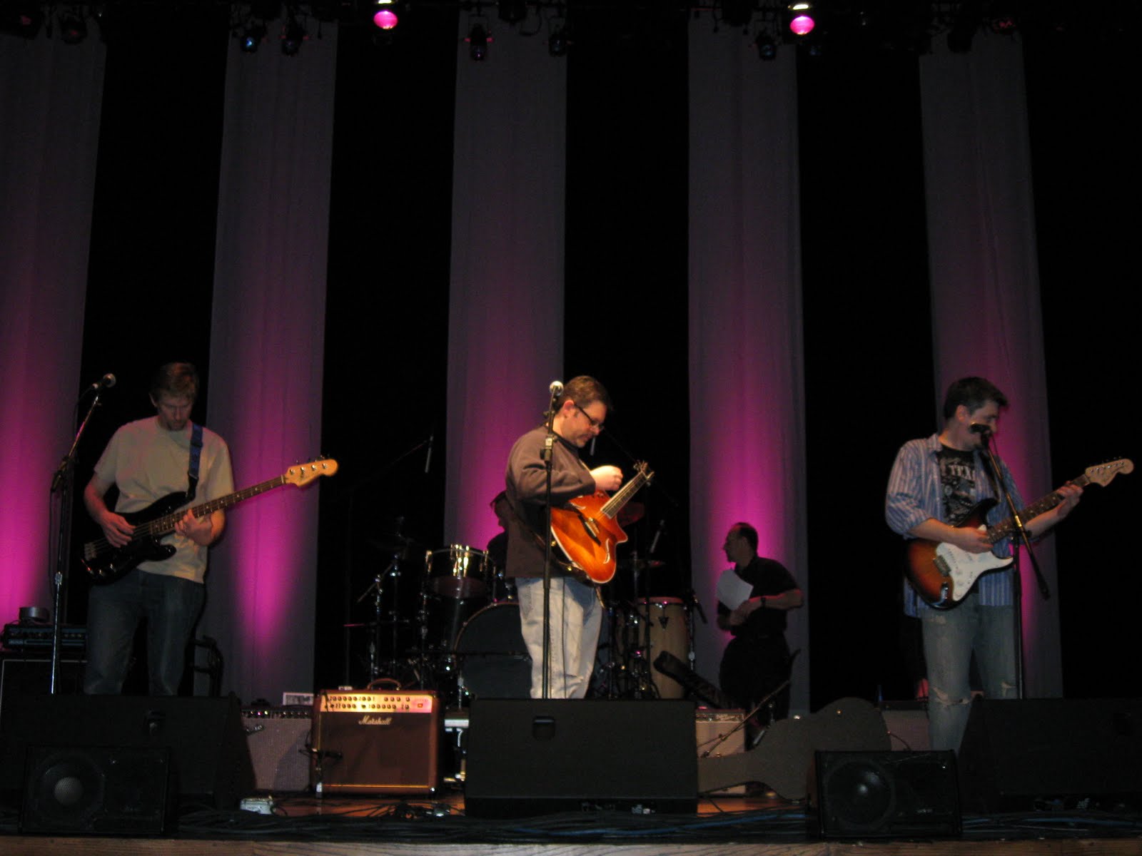 Pictured above: The Mojo Daddies, singing and playing. L to R: Rob Twardock (bass/keyboards), Jim Campbell (drums--hard to see in this photo!--talking with the stage manager), Mike Dikelsky (rhythm guitar) and Craig James (lead guitar).