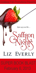 Liz Everly is a passionate cook, writer, and traveler. Exploring food and romance in Saffron Nights, Liz ombines her lifelong love of action-packed romance with her culinary expertise. She loves to interact with readers. Please follow her on Twitter @Lizeverly1, check out her website http://www.lizeverly.worpress.com. You can also find her on Facebook and blogging at http://www.ladysmut.com.