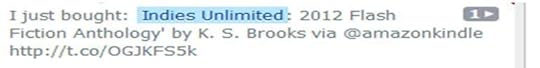 I put in an alert for Indies Unlimited and found a tweet by someone announcing that they bought the new 2012 Flash Fiction Anthology (I’ve removed the user info for display purposes.) Notice that there are no @’s or #’s to search with—if you were using Tweetdeck or Hootsuite, you would have missed this. With Mention, you now have a chance to Tweet back and thank them for buying your book.