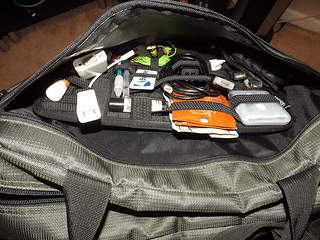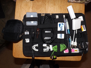 I have two laptop bags. One that is smaller and more fashionable for the short day trips to the local Starbucks or a Koha demo via train. The other is bigger and bulkier and much more practical for plane travel when I need to stuff a lot in to it. Regardless of the bag, I have the same laptop I bring and the same accessories I need anywhere I go. GridIt lets you put all of your little bits and bobs together in an organized fashion and then is easily transfered from one bag to another. See what I did here: