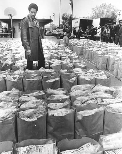 I think it’s telling that folks are more likely to circulate images of the BPP holding guns than they are of them passing out food. Even folks who supposedly support/ed the party. Guns are sexy and ~political~and virulent and masculine—groceries bags of food—that’s not what revolution is about. Except, that’s exactly what revolution is about.